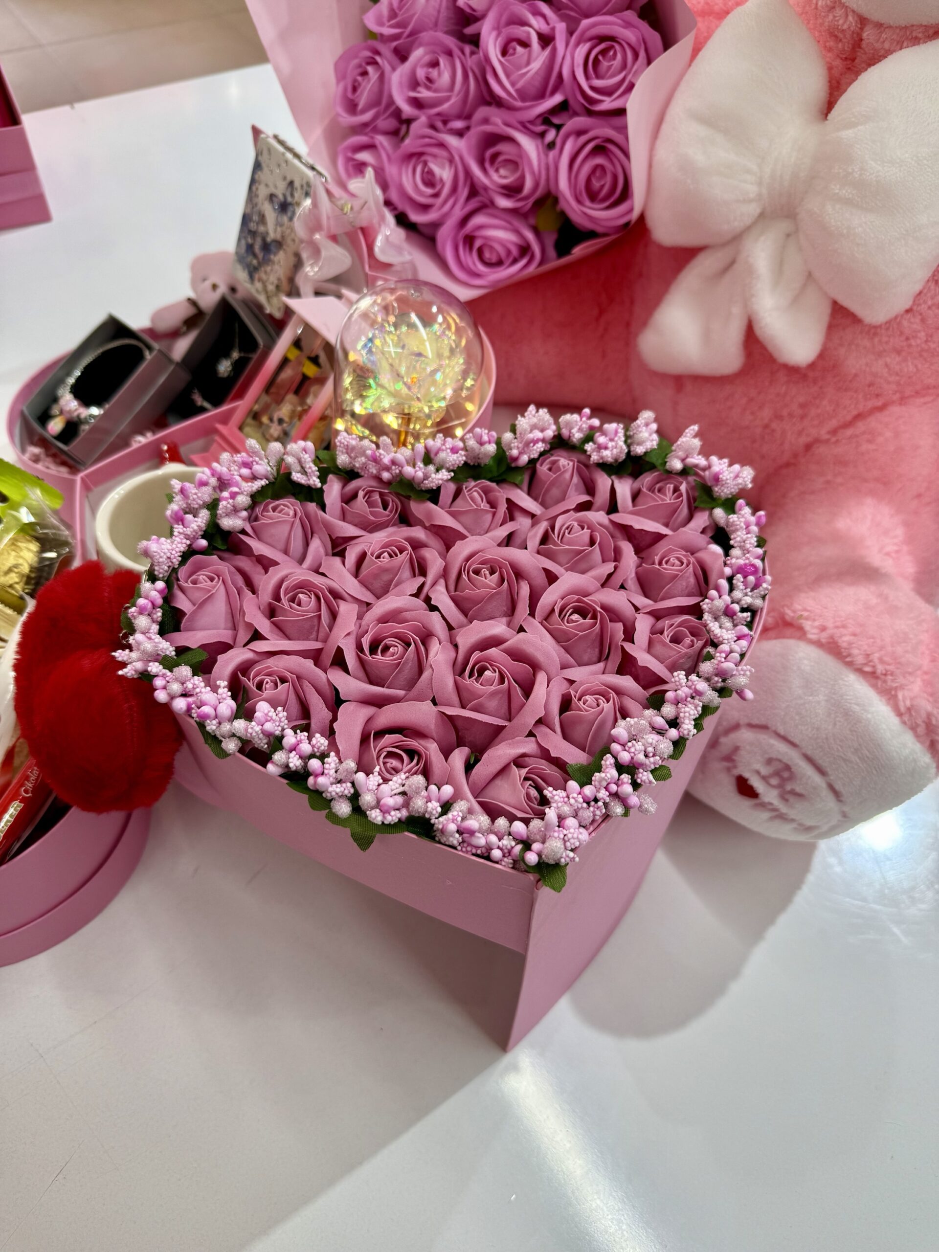 NOT: ÜÇ KATLI KUTUNUN İLK KATI SOLMAYAN KOKULU SABUN GÜLLER İLE SÜSLENMİŞTİR. DİĞER İKİ KATINDAKİ HEDİYELERE ULAŞMAK İÇİN KUTUNUN KURDELESİNİ ÇÖZÜP, KAPAĞINI KALDIRMANIZ GEREKMEKTEDİR.