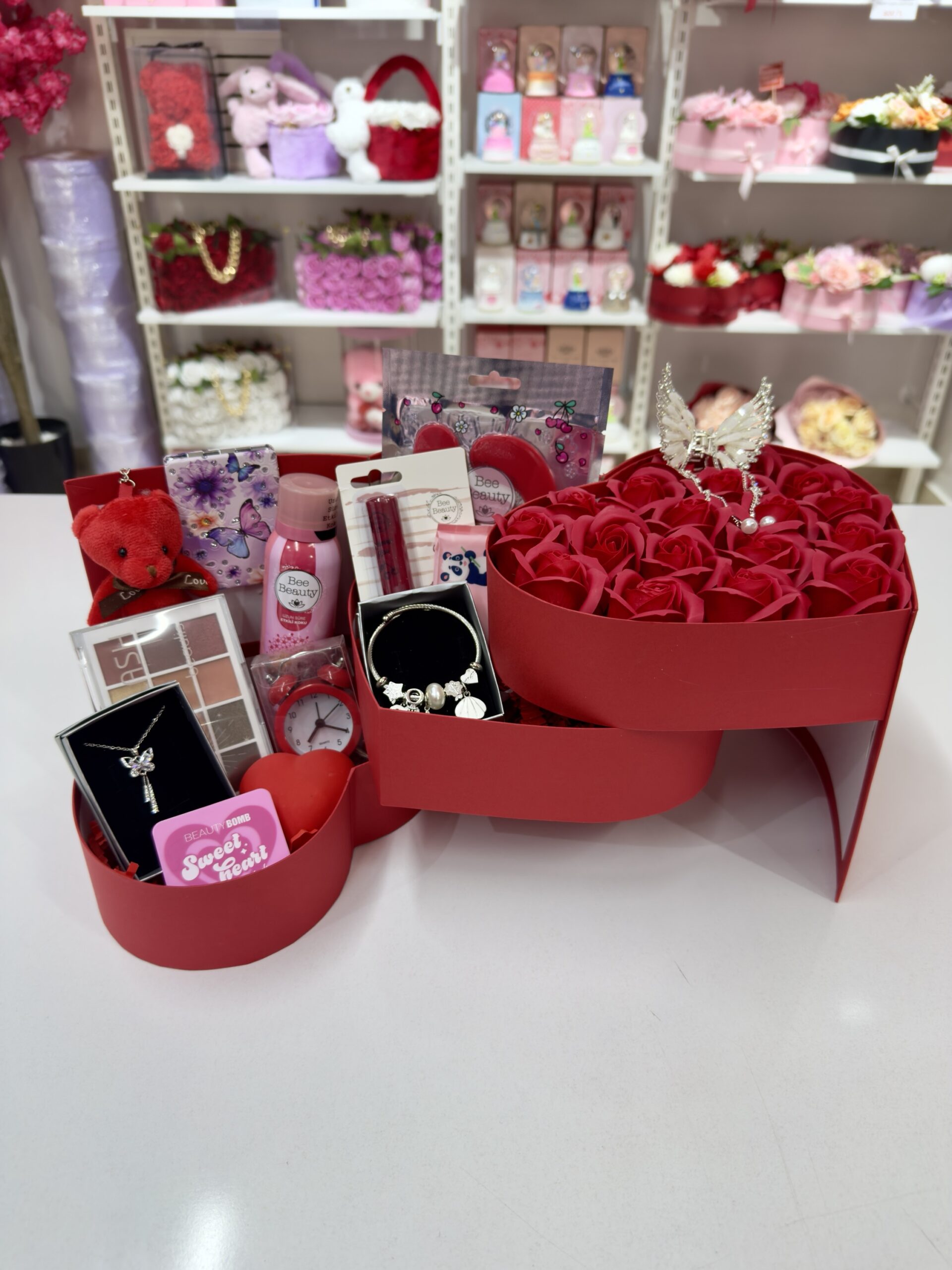 NOT: ÜÇ KATLI KUTUNUN İLK KATI SOLMAYAN KOKULU SABUN GÜLLER İLE SÜSLENMİŞTİR. DİĞER İKİ KATINDAKİ HEDİYELERE ULAŞMAK İÇİN KUTUNUN KURDELESİNİ ÇÖZÜP, KAPAĞINI KALDIRMANIZ GEREKMEKTEDİR.