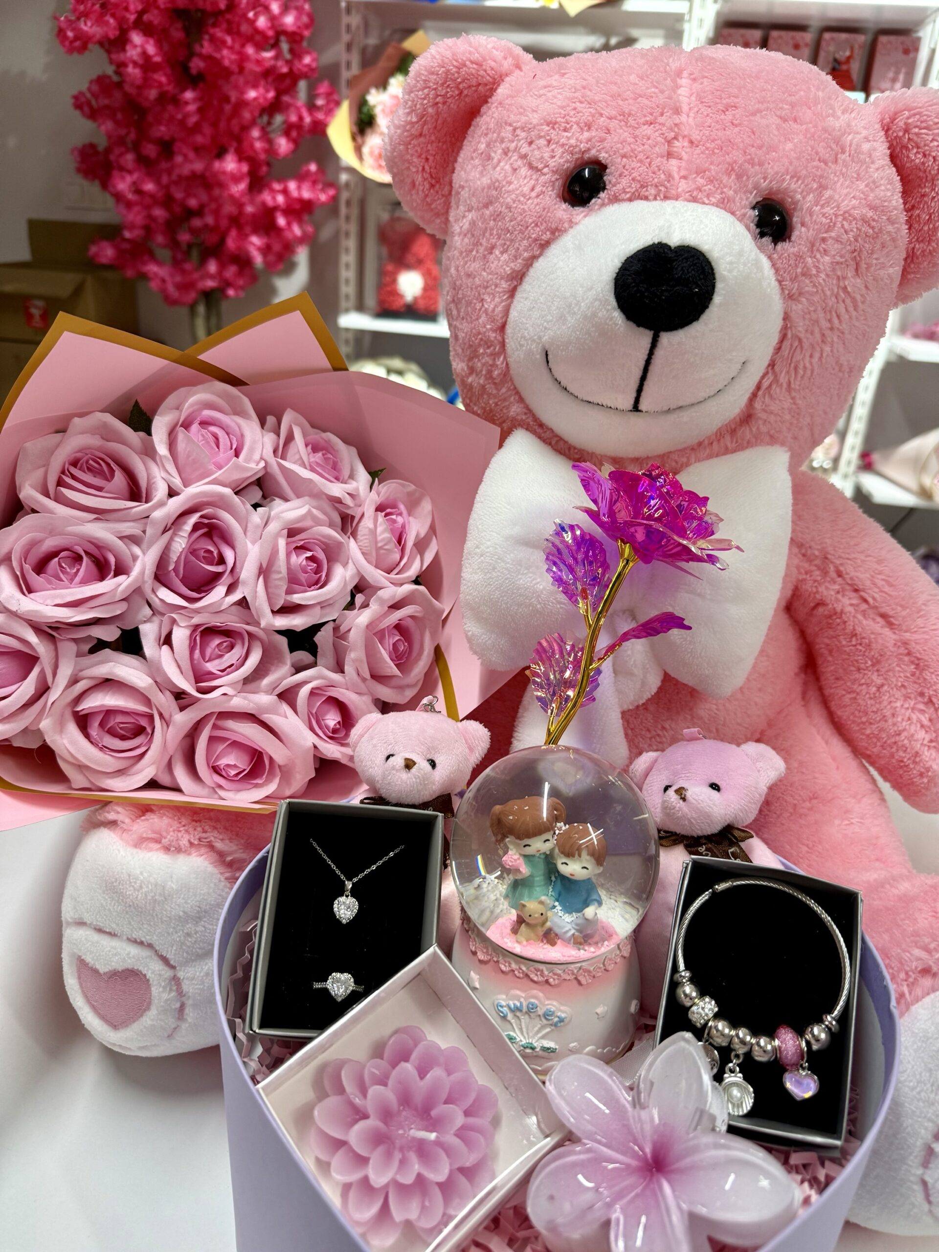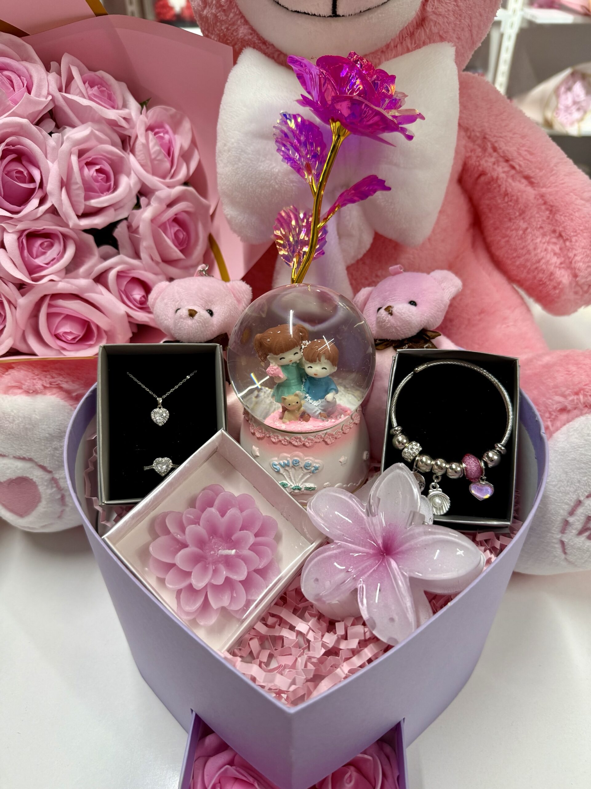 Ayı Evreni Pembe Aşk Evreni – Sevgiliye Romantik Hediye Kutusu | Kar Küresi + Takı + Ayıcık + Gül
